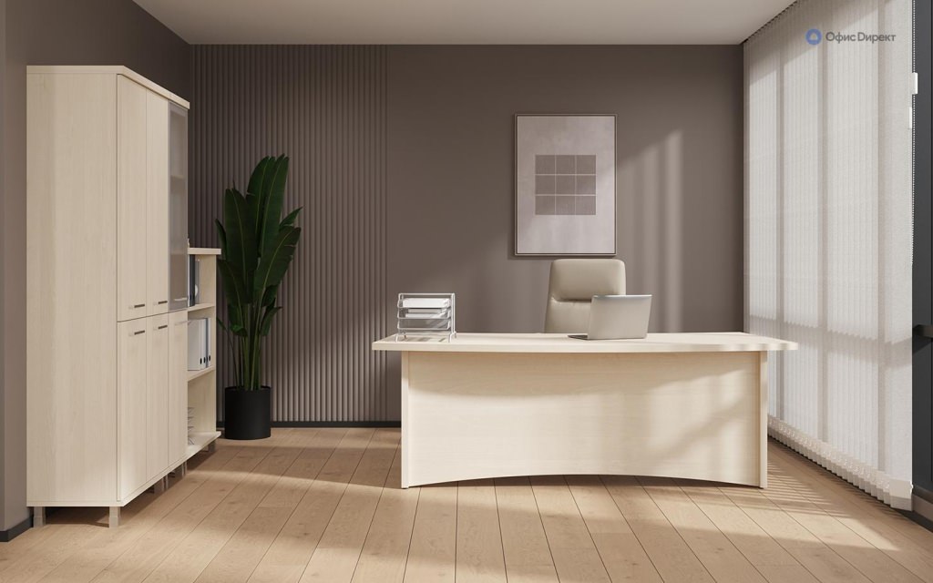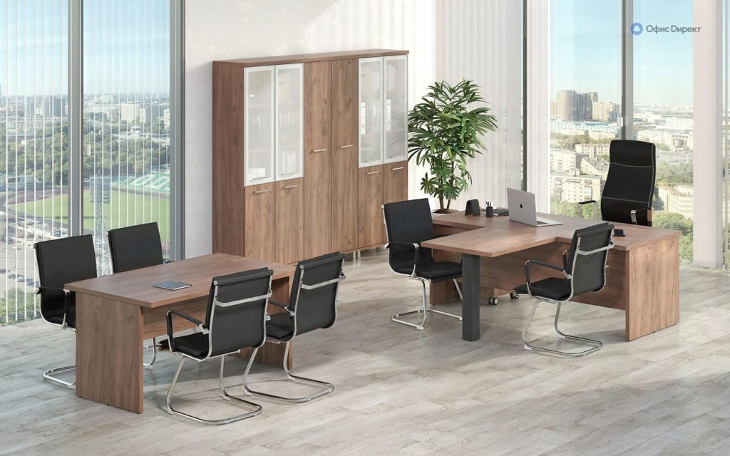 Кабинет руководителя «First» представляет собой образец классического рабочего пространства, в котором строгость и изысканность гармонично сочетаются.