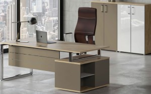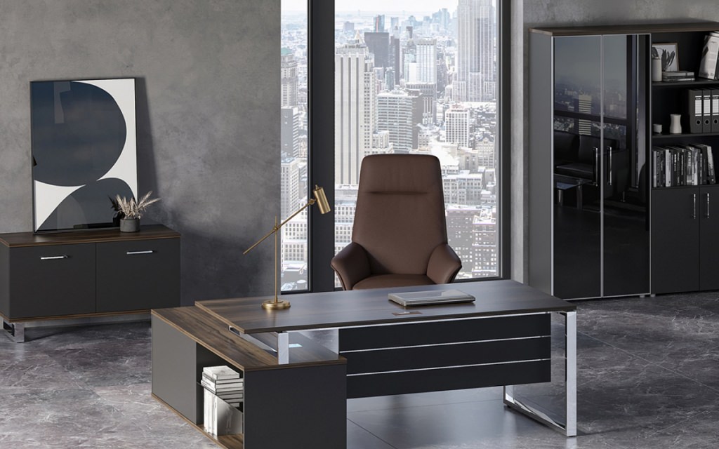 Riva Shiftr – воплощение интеллектуальной эстетики хай-тек в бизнес-пространстве. Хромированный металлокаркас создает визуальную легкость и подчеркивает технологичность коллекции. Сочетание благородных древесных текстур с пыльными оттенками и блестящими элементами формирует премиальный облик кабинета, мгновенно повышающий статус владельца.